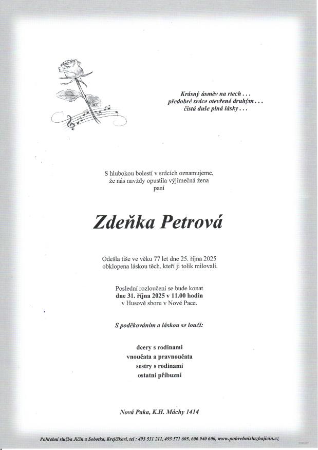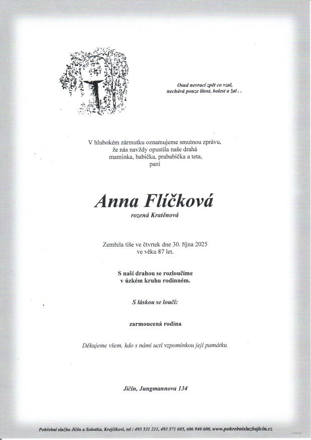 | Jsme rodinná firma podnikající od roku 1990. Ovšem tradice sahá daleko do minulosti, kdy paní Anastázie Zakouřilová byla v roce 1930 jmenována soboteckou hrobnicí a oblékačkou mrtvol, což po ní převzal její syn pan Karel Zakouřil, který pak v 60-tých letech nastoupil jako vedoucí pohřební služby v Sobotce. Po jeho smrti v roce 1973 převzala jeho místo dcera paní Alena Krejčíková, která mu do té doby pomáhala. V  roce 1978 k ní nastoupil její manžel pan Eduard Krejčík a spolu pracovali v ops Jičín do roku 1990, kdy firmu odkoupili a založili tak již dnes známou firmu Pohřební služba Krejčíkovi. V roce 1992 se firma rozrostla o jejich dva syny Petra a Pavla, později i s jejich manželkami a rozšířila se o pobočku v Jičíně, kde podniká dodnes. Firma má 8 zaměstnanců (převážně rodinných příslušníků) , 2 kanceláře (v Sobotce a v Jičíně) a 3 speciální pohřební vozidla (viz. vozový park).Jsme připraveni, pomoci Vám ve chvílích nejtěžších se zajištěním posledního rozloučení s Vašimi blízkými v našich kancelářích i na našich nonstop linkách, kde nás neváhejte kdykoli kontaktovat.
